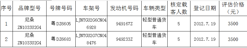 受委托,定于2020年7月22日(星期三)下午3时在我司拍卖厅公开拍卖:①粤DZ6605尼桑牌汽车,起拍价3500元;②粤DZ6683尼桑牌汽车,起拍价3500元。