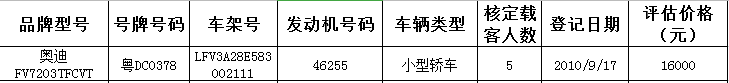 受委托,定于2020年8月21日(星期五)下午3时在我司拍卖厅公开拍卖:粤DC0378奥迪牌汽车,起拍价16000元。