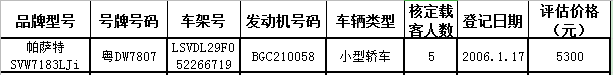 受委托,定于2020年12月31日(星期四)下午3时在我司拍卖厅公开拍卖:粤DW7807帕萨特牌汽车,起拍价5300元。