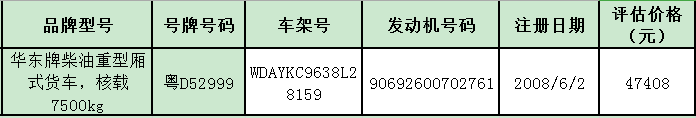 受委托,定于2021年5月11日(星期二)下午3时在我司拍卖厅公开拍卖:粤D52999华东牌货车,起拍价:47408元。