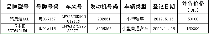 受委托,定于2021年6月11日(星期五)下午3时在我司拍卖厅公开拍卖:①一汽奥迪A4L小型轿车,起拍价:60000元;②一汽丰田SCT6491E4小型普通客车,起拍价:160000元。?xml:namespace>